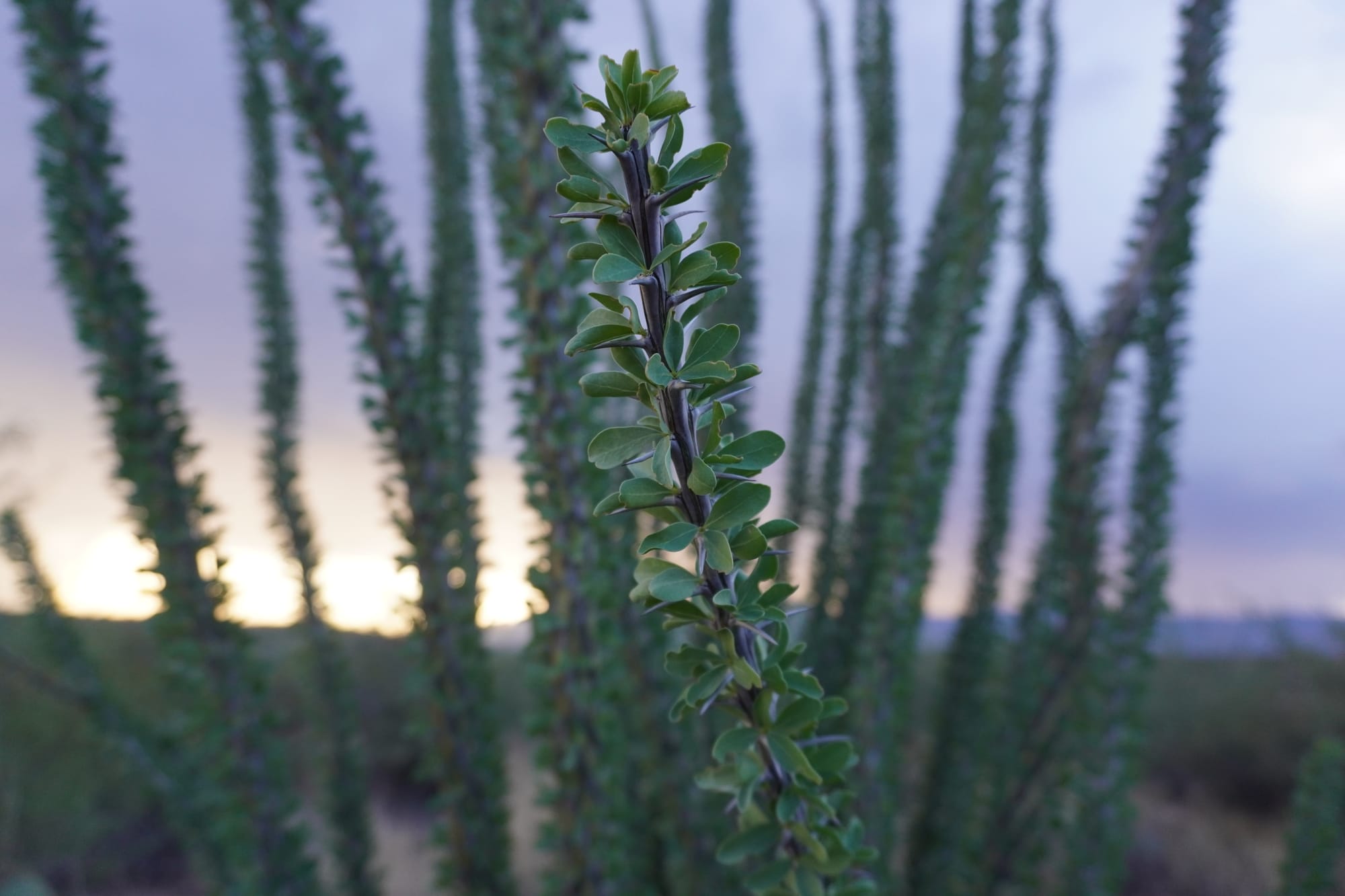 The gardens are full of new sights. Full of ocotillo, which seems like a plant that should be waving at the bottom of a fish tank, so elongated and seaweed-like are its many-leaved stems—of jojoba, with its wavy, upturned pairs of little green-gray leaves—of foothill palo verde and it’s green, photosynthesizing bark—of cholla cacti and its innumerable desert relatives, sometimes with a cactus wren’s nest hooked into its spines—of saguaro on the surrounding hills, an endless forest of sturdy green towers.