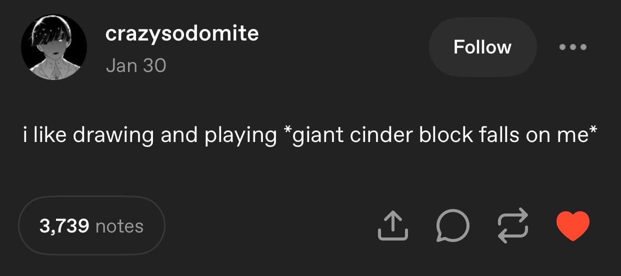 I love that I went to the bookstore this morning to buy a book of poems by Ada Limón and couldn’t find any of her books in the poetry section, but found one instead right next to a book of short stories I was also looking for. I love matcha and many other teas and coffee, the hot and cold liquid flavors of plants: the baffling diversity of two plants, grown and dried and twisted and ground and prepared differently. I love sitting on the floor when I’m sweaty or dirty and watching a YouTube video before I shower—going to Lisbon, Portugal on the floor with a vlogger from Spassk, Russia when I’m dirty or sweaty right before I take a shower. I love professional YouTube philosophers: CJ The X, Abigail Thorn, Natalie Wynn. Trans women, two of them—I love trans women and I love trans people, in general, and internet people. Queer people online, their humor—specifically people on Tumblr, their humor in 2025, their relatable manner of confronting relentless bad tidings by being both self-possessed and unhinged. Here is a photo: