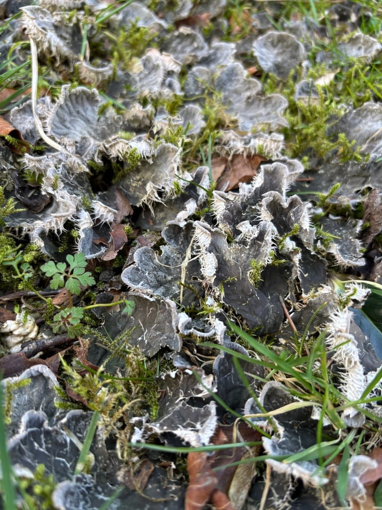 I love that frogs know when it’s about to storm, that some of them have a specific croak to describe their knowledge of a storm’s approach. I love lichen, love how they are composites of two, three, four different organisms—how they contain, are constituted of, photobiont, mycobiont, sometimes an additional photobiont, sometimes also a yeast. I love "I Love My Wife," the song by the Cincinnati, Ohio-based band Touchdown Jesus, which was just released on April 4, last week. I love membranous pelt lichen specifically, its name and its appearance–slimy and soft, both, at once—but also other lichens and their names. Someone took a picture of membranous pelt lichen on the Isle of Man on March 15, last month. Here is a photo:
