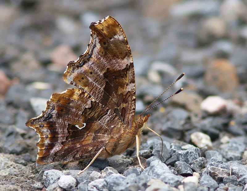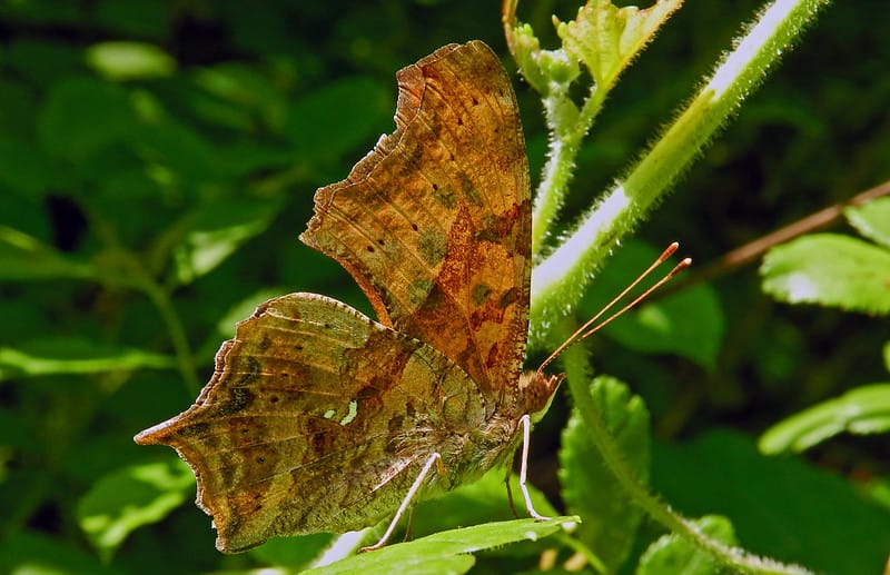 Despite that, I did indeed meet and learn about some unfamiliar butterflies. It honestly delights me how much I still don’t know about the world in the immediate vicinity of where I grew up. After spending a good half-hour or so mildly baffled as my teammates kept shouting about punctuation, for example, I learned that there are, in fact, two butterflies named after punctuation: the Eastern Comma and the Question Mark. Both butterflies are in a family called the Anglewings, and both resemble rather large, brown, decayed leaves, or leaves that have had their edges munched away at. The main difference between them is a small white mark on their wings; one has a white spot resembling a comma, the other a question mark.
